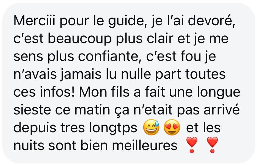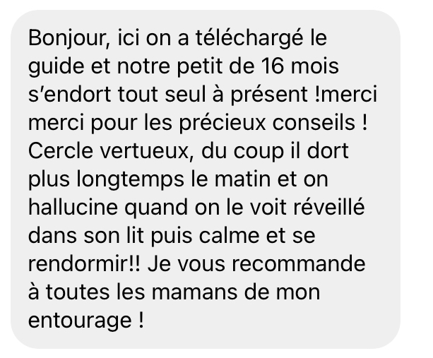 Peut-être que vous réalisez que ce pack vous aidera mais qu'il vous faudrait plus; votre enfant se réveille régulièrement la nuit? Refuse parfois la sieste? Se réveille à 5h le matin ou encore met très longtemps à s'endormir? C'est plutôt l'atelier vidéo sur le cercle vicieux du manque de sommeil qu'il vous faut. Tous les secrets pour sortir de cet enfer. C'est ici <<cliquez