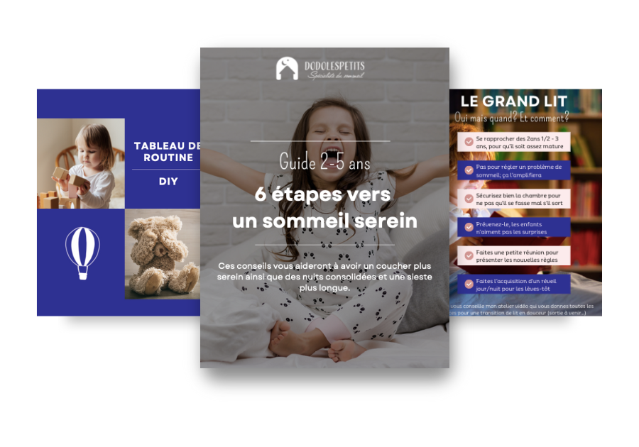 L'indispensable pour appréhender sereinement le sommeil des enfant entre 2 et 5 ans. Le guide à avoir et ses brochures incontournables (les heures réparatrices, comment stopper les réveils à 5h, le sevrage de la tétine...)